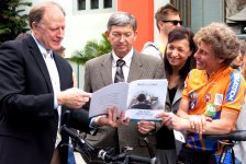 Reverend Bob Adams of the Church of Scientology International and Hollywood Chamber of Commerce president Leron Gubler welcomed two Russian Federation athletes April 1st, who are raising awareness of the need for drug education. The cyclists, Alen Khairullin and Pavel Grachev were in Hollywood today having just reached the halfway mark on their route to circle the globe.
